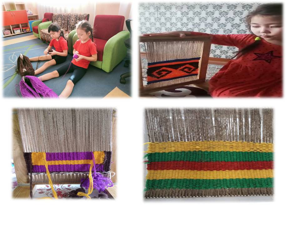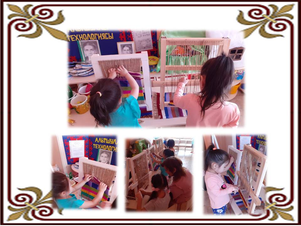 Балабақшамызда Алаша тоқу технологиясының элементтерін қолдана отырып 2021-2022 оқу жылынан бастап жұмыс жасап келеміз. «Алаша тоқу» технологиясының элементтерін қолдана отырп қазақ халқының халықтардың өнер туындыларына қызығушылық танытады; қазақ оюларының элементтерін салады, Негізгі түстермен қоса қоңыр, қызғылт сары, ашық жасыл реңктерді таниды; зерттейді;заттарды қарайды, қолмен ұстап бақылайды.Қол моторикасы дамиды,шапшаңдыққа,әсемдікке үйренеді.